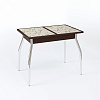 Длина прямоугольной столешницы - 90 см, с помощью механизма “бабочка” ее можно еще немного увеличить - до 1 м 20 см. Изготовлена она из сочетания ЛДСП и МДФ, сверху - закаленное окрашенное стекло. Возможны варианты с кожзамом, фотопечатью. Ноги прямые или гнутые, могут быть сделаны из хромированной стали или массива березы белого, кремового или цвета венге. В любой комбинации служат надежной опорой изделию даже в разложенном виде.